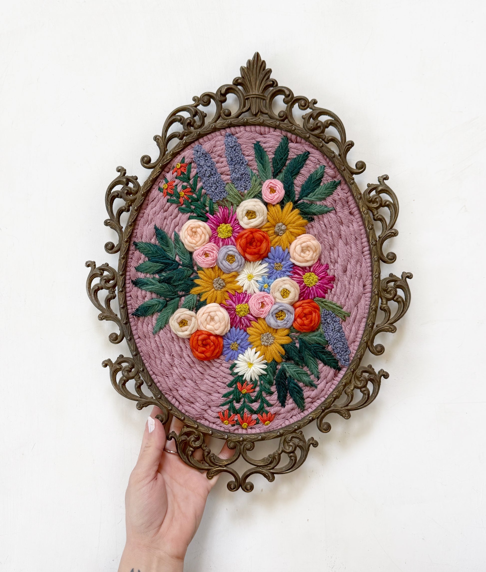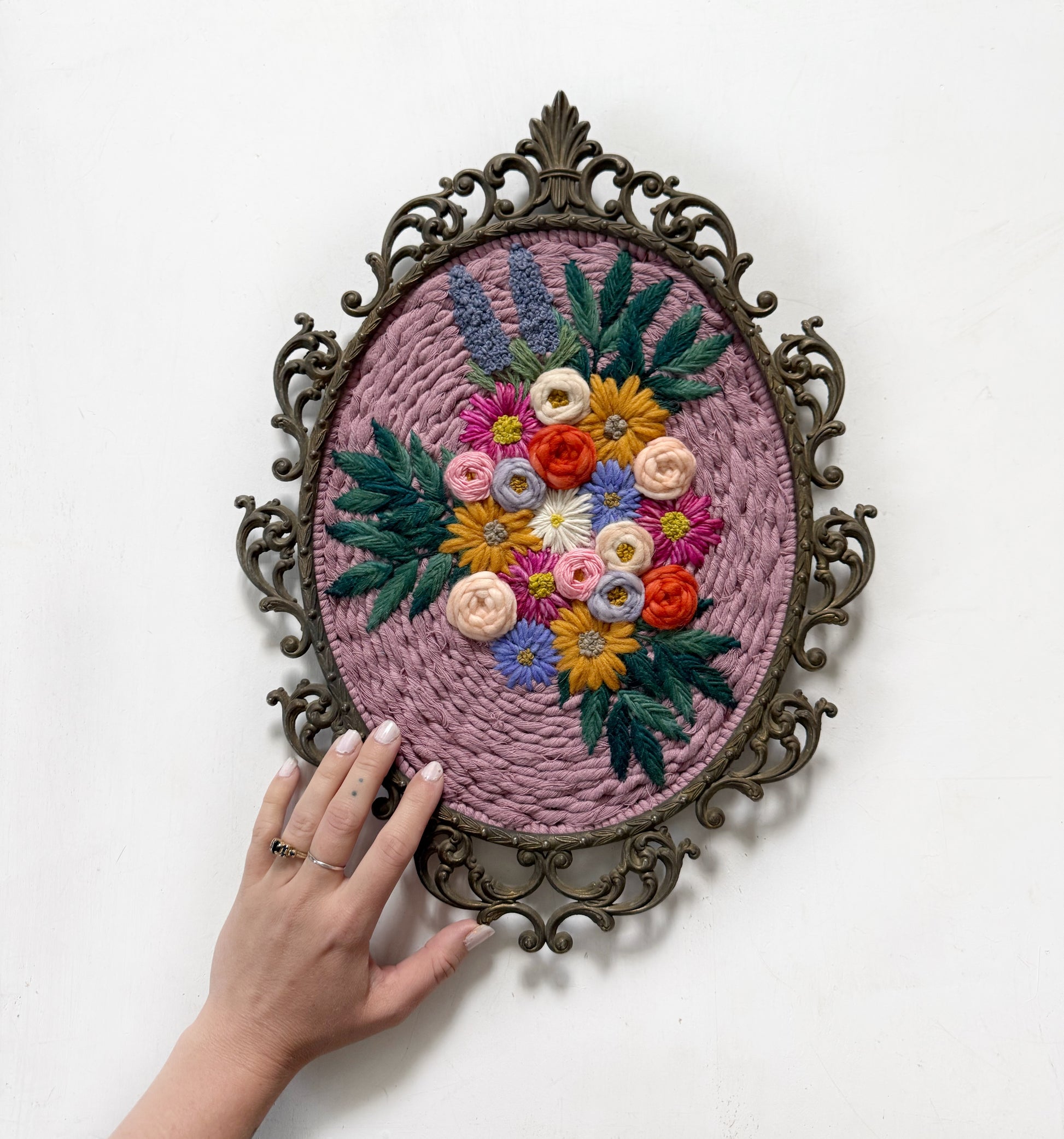 This large tapestry has a muted mauve base and will be filled with embroidered flowers and greenery. I will post pictures as I progress with the embroidery.
