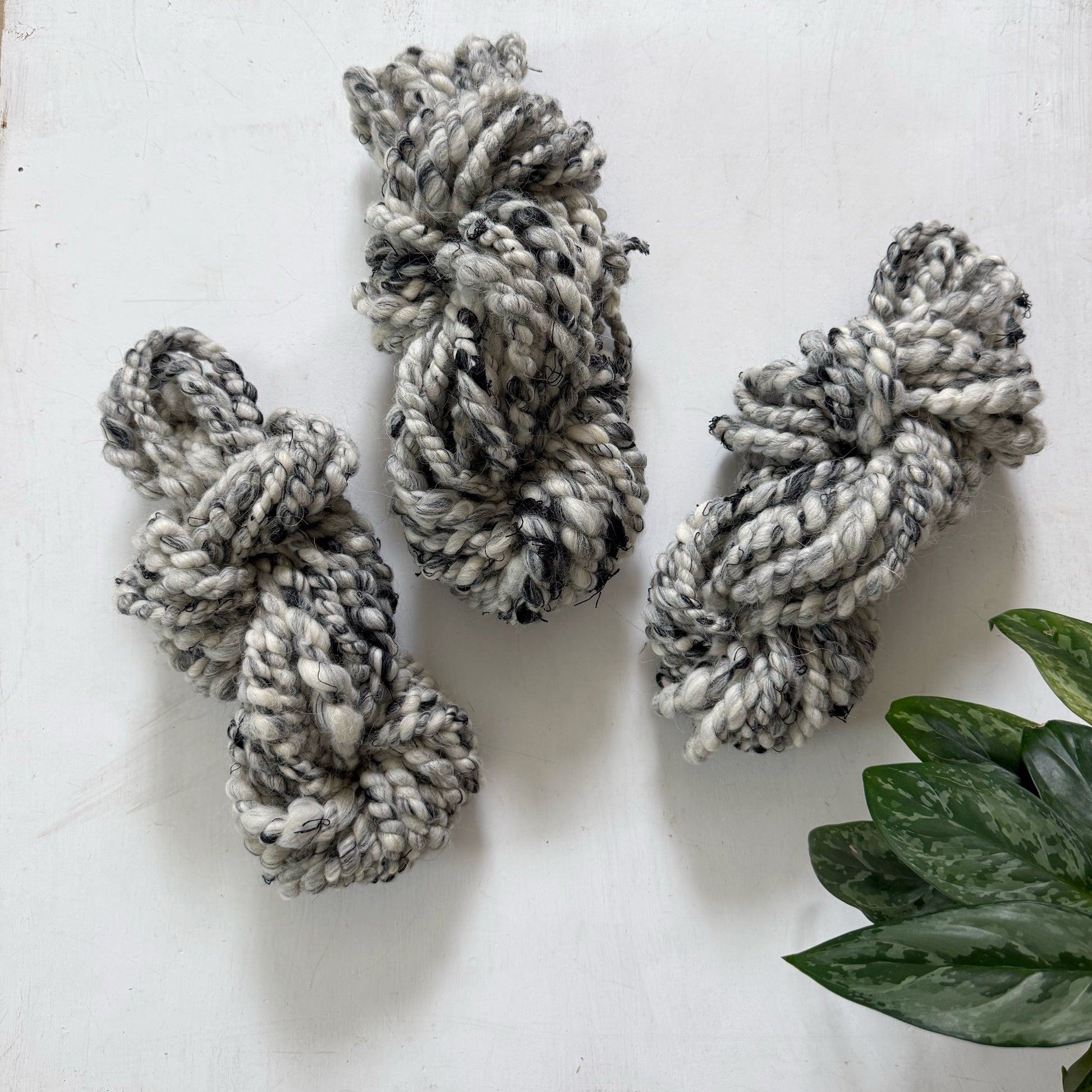 One of a kind handspun yarn, spun with care and attention to detail. The base is merino and top white with black cotton scraps.
